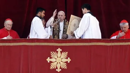 Asomado al balcón de la logia central de la basílica de San Pedro, el Papa comenzó su mensaje observando que hay tinieblas en los corazones humanos, en las relaciones personales y las familias y en los conflictos económicos, geopolíticos y ecológicos, pero añadió "que más grande es la luz de Cristo".