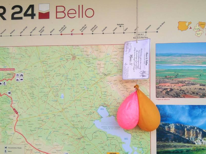 El día del enlace, colgaron este texto cientos de veces en unos globos para lanzarlos al cielo desde el pueblo parisino de Saint Jean de Beugné. Pero después de volar 850 kilómetros, solo uno llegó a su destino: la pequeña localidad de Bello, Teruel.