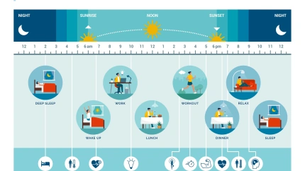 Ritmo circadiano y actividades diarias: cómo la exposición a la luz solar regula los procesos corporales durante el día y la noche.