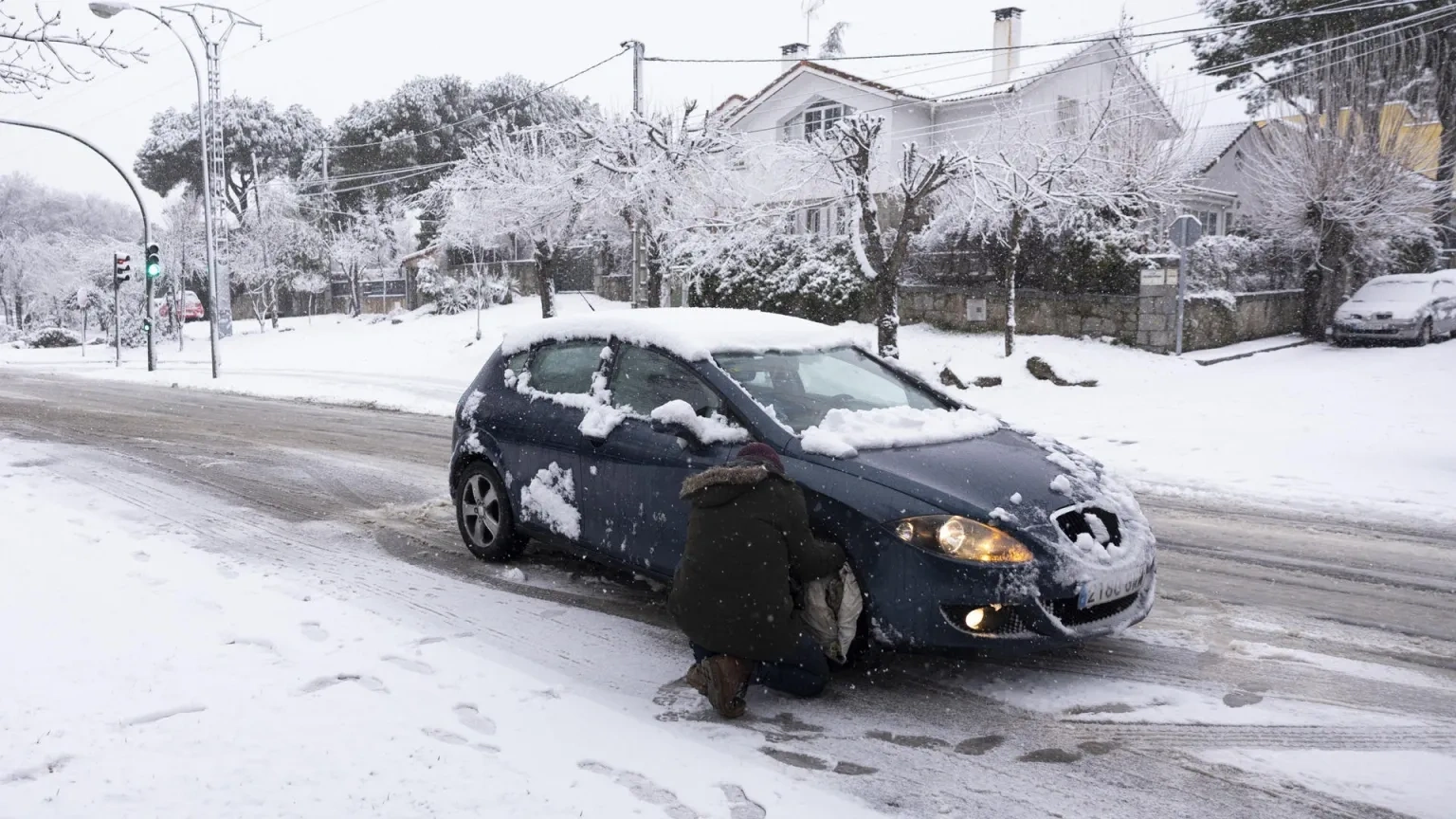 Un hombre pone las fundas a las ruedas de su coche para poder circular en una carretera en Alpedrete, este miércoles, en el que la borrasca Kristin deja nieve en la región de Madrid.