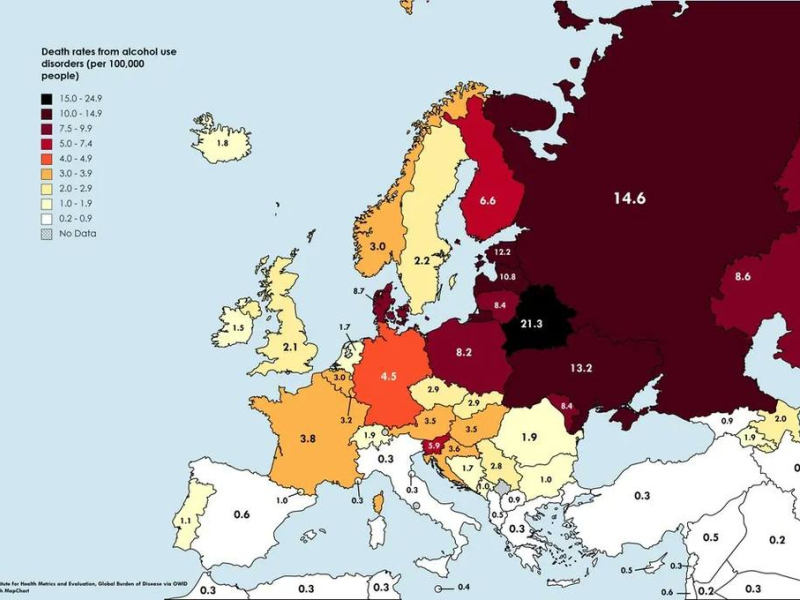 El mapa que muestra cuáles son los países europeos con mayor tasa de mortalidad por alcoholismo