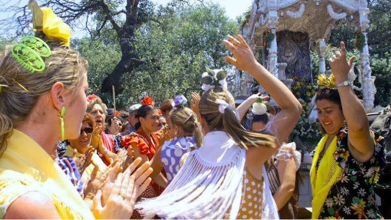 Los cantes por sevillanas, la flauta y el tamboril, se mezclan con palmas y olés y vivas a lo largo de un trayecto, más largo para unas que para otras, pero con un denominador común, el ansia de llegar a las plantas de la Virgen del Rocío un año más, de confluir en ese epicentro mariano en el que se unen devoción y folclore.
