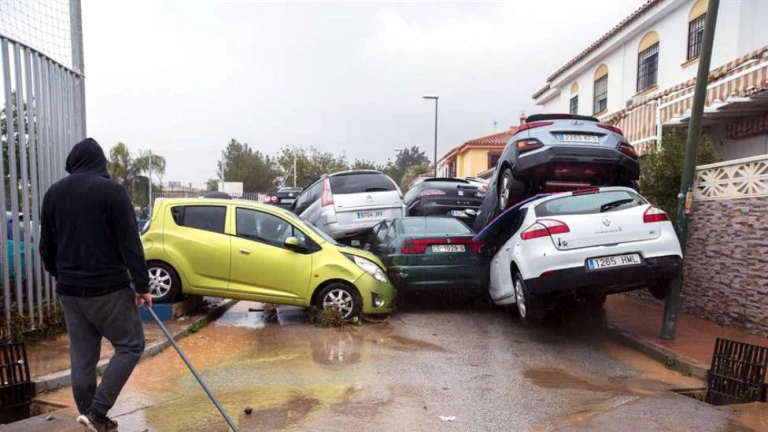 Coches amontonados, subidos a las aceras y uno de ellos que incluso ha llegado a irrumpir totalmente en una sucursal bancaria llevado por la fuerza del agua de la intensa lluvia caída en Campanillas, distrito de Málaga capital, es el escenario de este enclave afectado por el temporal, cuyos vecinos describen a Efe lo ocurrido esta madrugada como "un tsunami".