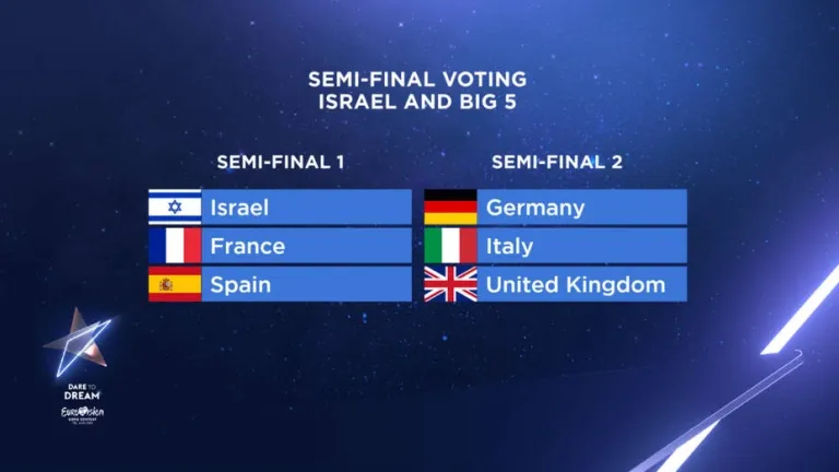 En el acto, se decidió en qué eliminatoria votarán los miembros del denominado BIG5 (Alemania, España, Francia, Italia y Reino Unido) y el país anfitrión, Israel. España, Francia e Israel votarán en la semifinal 1, el 14 de mayo, mientras que Italia, Alemania y Reino Unido lo harán en la segunda, el día 16. En la primera mitad de la primera semifinal competirán Eslovenia, Bielorrusia, República Checa, Montenegro, Chipre, Serbia, Finlandia, Polonia y Hungría. En la segunda, participarán Estonia, Portugal, San Marino, Islandia, Georgia, Australia, Bélgica, Ucrania y Grecia. Y en la segunda semifinal, tomarán parte en la primera mitad Suiza, Suecia, Irlanda, Austria, Moldavia, Letonia, Rumanía, Dinamarca y Armenia, mientras que la segunda mitad enfrentará a Albania, Azerbaiyán, Macedonia, Noruega, Rusia, Países Bajos, Croacia, Lituania y Malta.