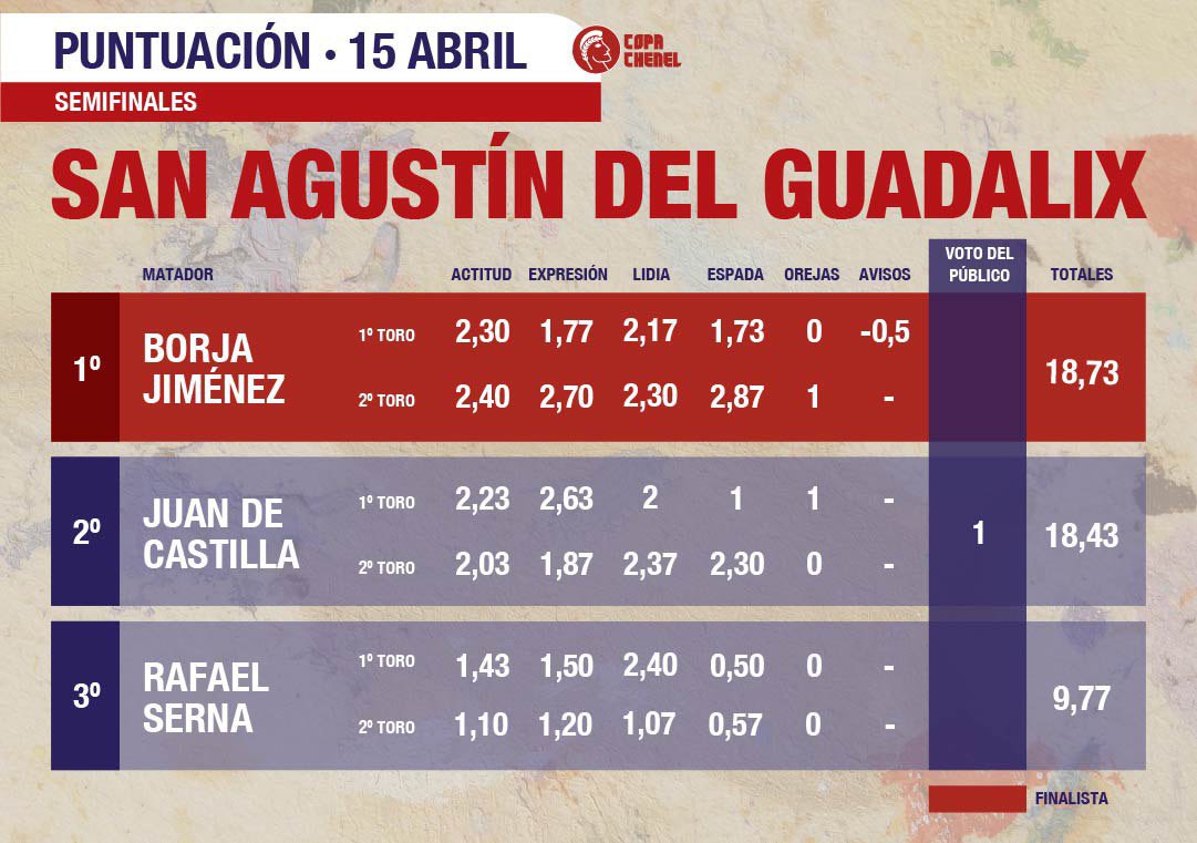 El jurado otorgó un 18,73 a Borja Jiménez frente al 18,43 de Juan de Castilla, incluyendo el punto extra referido al voto del público, que fue obtenido por el colombiano con un 65,8%, frente al 33,2% del sevillano. De esta forma, Borja Jiménez se proclama triunfador de la tarde convirtiéndose en el primer finalista de la Copa Chenel.