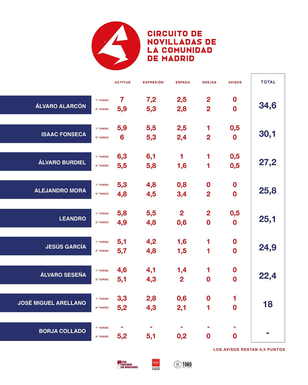 Los novilleros Álvaro Alarcón, Isaac Fonseca, Álvaro Burdiel, Alejandro Mora, Jesús García y Leandro Gutiérrez son los seis semifinalistas de la primera edición del Circuito de Novilladas con picadores de la Comunidad de Madrid, organizado por la Fundación Toro de Lidia apoyado por la Comunidad de Madrid.
