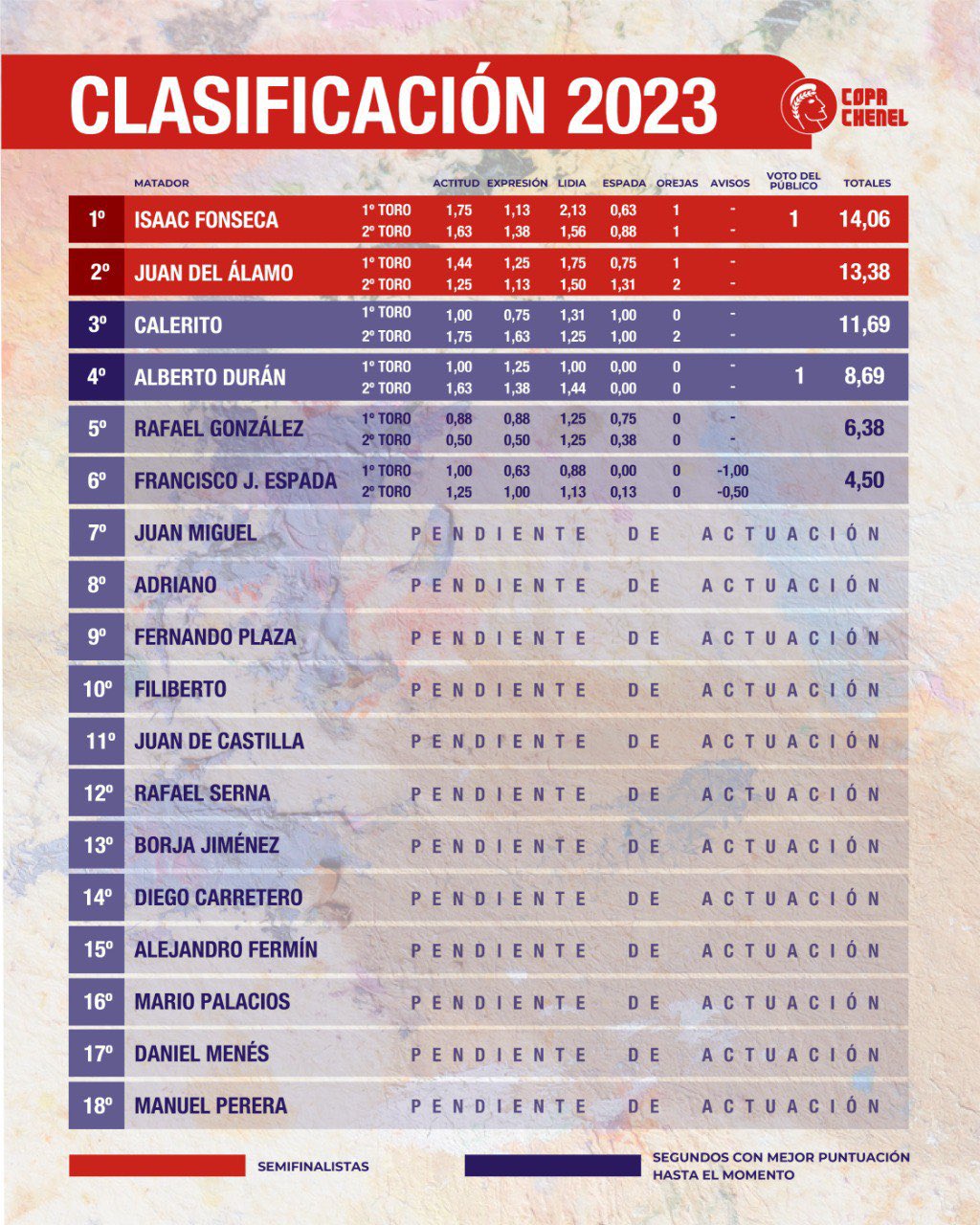 La primera clasificación de la Copa Chenel 2023 la encabeza el semifinalista Isaac Fonseca con 14,06 puntos, incluyendo así el voto del público. Se sitúa por detrás Juan del Álamo, marcado en color rojo, como triunfador en su festejo, con 13,38 puntos.
