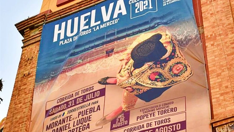 que cada año se despliega en la fachada principal de la Plaza de Toros 'La Merced' de Huelva y que cuenta con el patrocinio de