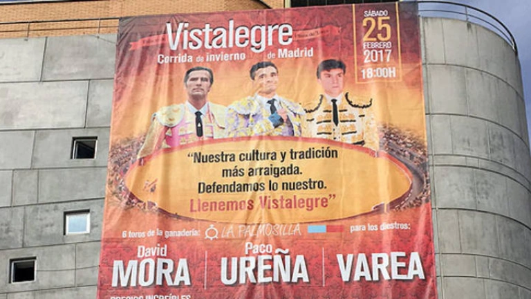 La Corrida de Invierno de Madrid se publicita en el Palacio Vistalegre con una gran lona reivindicativa.