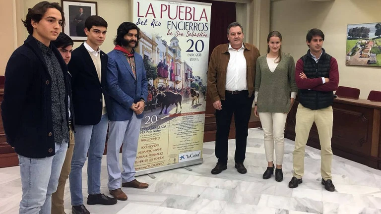 Morante, el alcalde Manuel Bejarano y los novileros durante la presentación de los festejos de San Sebastián en La Puabla del Río