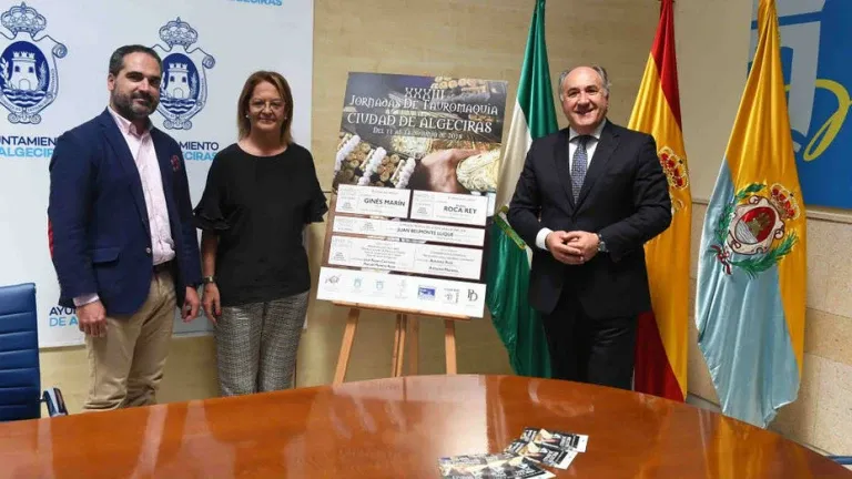 El alcalde de Algeciras, José Ignacio Landaluce, acompañado por la teniente de alcalde delegada de Feria y Fiestas, Juana Cid, y José Manuel Laza, responsable de comunicación de la empresa Lances de Futuro, concesionaria de la plaza de toros “Las Palomas”, ha presentado este lunes en el Ayuntamiento el programa de las XXXIII Jornadas de Tauromaquia “Ciudad de Algeciras”, que se celebrarán del 11 al 14 de junio en el edificio municipal “La Escuela”, a las ocho y media de la tarde con entrada libre y gratuita.