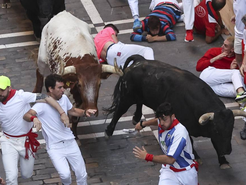 En la Plaza Consistorial este toro ha arremetido contra los mozos, lo que le ha retrasado de la manada, cuya cabeza ha tomado uno de sus hermanos, que ha continuado igualmente a buena velocidad, pese a que tanto en la Estafeta como en el callejón se han registrado caídas de toros.