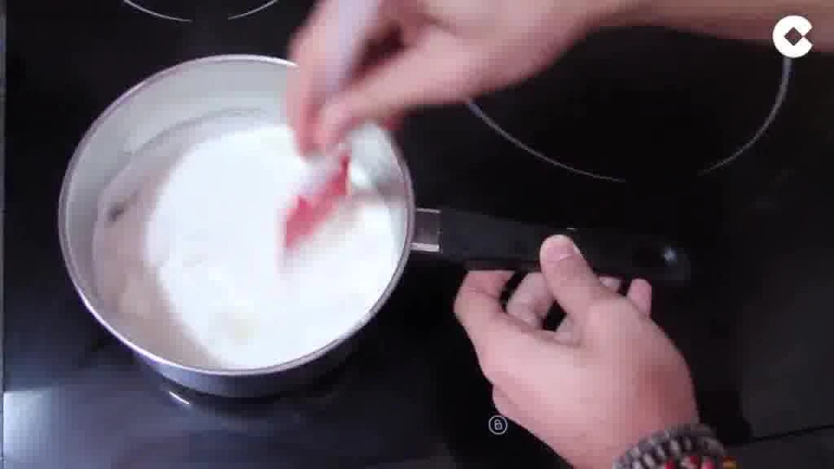 Cuando la nata está caliente añadimos el chocolate blanco. Removemos hasta que se funda completamente.