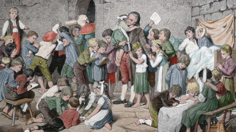 Visita del educador suizo Johann Heinrich Pestalozzi al orfanato de Nidwalden, Suiza (1882).