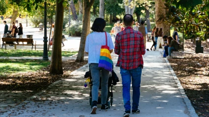 Pareja joven paseando con un cochecito de bebé en el parque del retiro de Madrid.