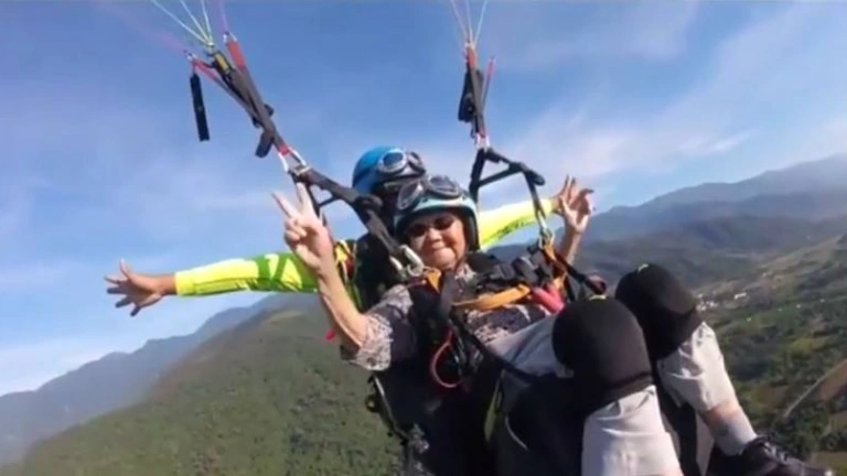 Chin es una señora de 93 años que ha cumplido su sueño de volar en parapente. Los monitores no la creían capaz de dar el salto hasta que la vieron con los arnés puestos.