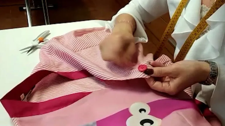 En la primera clase nos explica cómo coser un botón. "Apuntamos en la parte de arriba donde va a ir el botón y pasaríamos la aguja por los agujeros del botón. Si os fijáis tengo el hilo doble. Por el último agujero le haré un pie al botón. Es decir, dar unas cuantas vueltas alrededor del botón para que se quede firme y se quede algo despegado de la tela", va explicando.