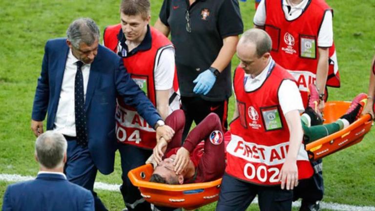 El futbolista portugués recibió un golpe de Payet en la rodilla que le obligó a recibir asistencia médica. Volvió al terreno de juego un par de veces, pero no pudo continuar y finalmente fue evacuado en camilla.