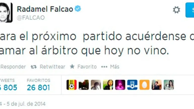 El colombiano Radamel Falcao, que se ha perdido el Mundial de Brasil al no recuperarse a tiempo de la lesión en el ligamento anterior cruzado de la pierna izquierda que se produjo en enero, siguió el partido de su selección frente a la anfitriona en Twitter. El delantero pidió el aliento de sus seguidores para apoyar a los hombres de Pekerman y no dudó en criticar la labor arbitral del español Velasco Carballo."Para el próximo partido acuérdense de llamar al árbitro que hoy no vino". Así de explícito se muestra el perfil de Twitter del jugador del Mónaco. La expulsión perdonada a Julio César en el penalti a favor de Colombia y las continuas faltas cometidas sobre su compañero James Rodríguez eran parte de los motivos del mensaje del 'Tigre'.Por su parte, la FIFA, al finalizar el choque de cuartos en el estadio Castelao, felicitó al colegiado madrileño de 43 años por su actuación, que no dejó contento ni a cafeteros ni brasileños a tenor de las quejas de ambas expediciones.Al término del encuentro varios jugadores cafeteros criticaron también la actuación de Velasco Carballo. El delantero del Sevilla Carlos Bacca aclaró que en la jugada del penalti, el portero rival Julio César debió "ser expulsado". "Fue una jugada con James y yo llego antes al balón que el portero, que me arrolla. Una buena jugada que podía haber sido expulsión del portero. Pero estamos en Brasil", lamentó.El capitán de Colombia, Mario Alberto Yepes, calificó como "muy malito" el arbitraje, aunque matizó que "suena mal" hacer críticas después de perder. "Ha habido varias jugadas. Pero ahora parece fácil decirlo y suena mal después de perder. Pero fue muy malito el árbitro", declaró.