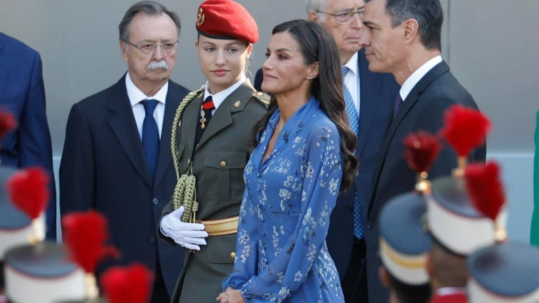 Los Reyes Felipe y Letizia, están acompañados en la tribuna de honor por la Princesa Leonor, vestida con el uniforme militar ya que este año está recibiendo instrucción militar en la Academía Militar de Zaragoza.