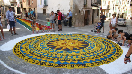 En Aguaviva, un municipio de poco más de 500 habitantes, todos los vecinos se vuelcan para decorar las calles con coloridas alfombras de serrín