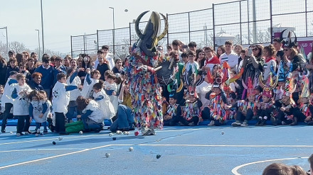 Los alumnos lanzaron bolas de papel a Moisés, un profesor de Piornal, para revivir la fiesta