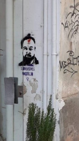 Un grupo femenista efectúa pintadas en Castellón contra Abascal y simula un disparo en su frente