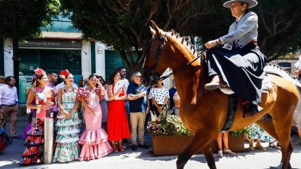 La cabalgata de Feria se luce con la participación de asociaciones de vecinos, siete grupos de folclore, la Banda Municipal, gigantes y cabezudos, y miles de almerienses.