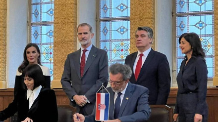 Felipe VI, junto a la reina Letizia, y el presidente croata, Zoran Milanovic, con su esposa, Sanja Music, han presidido el acto celebrado en los Archivos Estatales de Croacia