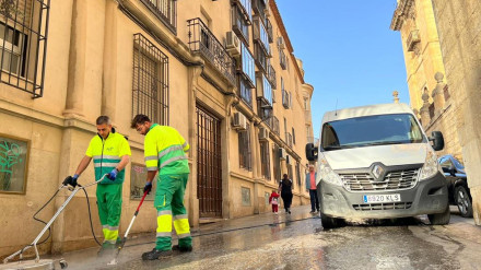 Varios equipos de limpieza se afanan en retirar la cera que ha ido dejando a su paso todas y cada una de las procesiones en las calles de Jaén esta Semana Santa