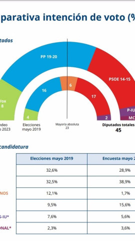 Obtendría entre 19 y 20 escaños mientras el PSOE conseguiría 14 o 15 diputados, Podemos-IU-Alianza Verde 2, Cs desaparecería y MC irrumpiría con uno