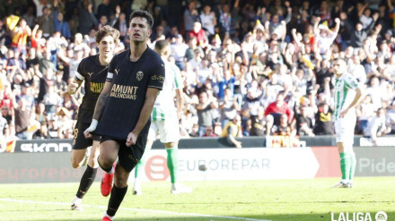 Locura en Mestalla. Llega el cuarto con una volea con la derecha del asturiano que se cuela en la escuadra más lejana de Rui Silva.