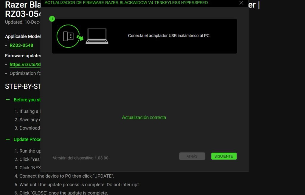 Uno de los grandes argumentos de este teclado es su conectividad inalámbrica avanzada. Razer apuesta aquí por su tecnología HyperSpeed Wireless a 2,4 GHz, con una tasa de sondeo de hasta 1000 Hz, lo que garantiza una latencia prácticamente indistinguible de la conexión por cable. Lo hemos probado una vez actualizado el firmware en Razer BlackWidow V4 Tenkeyless HyperSpeed Firmware Updater | RZ03-0548 y funciona perfecto por usb como por Wireless.
