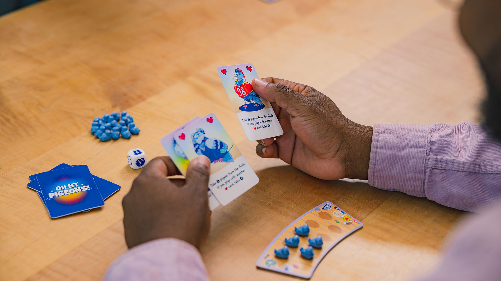 Se trata de “Oh my pigeons!”, un party game de Ravensburger en el que los jugadores deben acumular el mayor número de palomas en su banco para poder ganar las partidas. En este juego de cartas los participantes tienen que tentar a las palomas con comida, robárselas a tus compañeros o lanzar el dado para que vuelen por los aires. Su mecánica de juego es de lo más sencilla, por lo que es muy fácil de aprender: Tú siempre tienes que tener en tu mano tres cartas que te ofrecen diversas opciones, como recoger palomas, intercambiar tu banco con el jugador de al lado, obligar a tus compañeros a devolver sus palomas a la bandada, tirar el dado al banco de tus compañeros y recoger sus palomas o simplemente recoger palomas de la bandada.