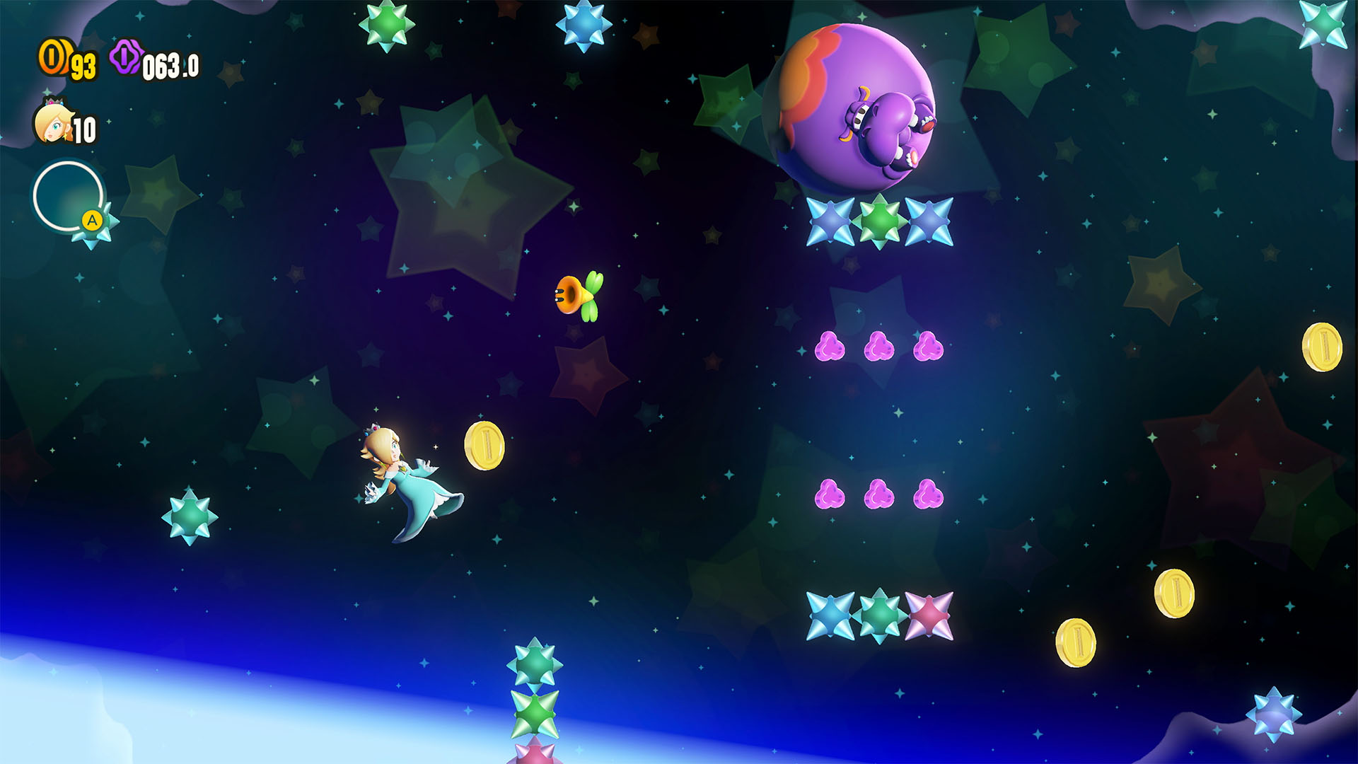 Además, la jugabilidad se expande con la incorporación de Estela como personaje seleccionable y el debut del Destello compañero, que puede ser controlado mediante el modo ratón de los nuevos Joy-Con para asistir en la recolección de monedas y derrota de enemigos. La estructura del juego también se ve desafiada por los esbirros de Bowser, quienes han robado las flores Belabel y se han ocultado en niveles específicos que deberemos superar para restaurar el orden.