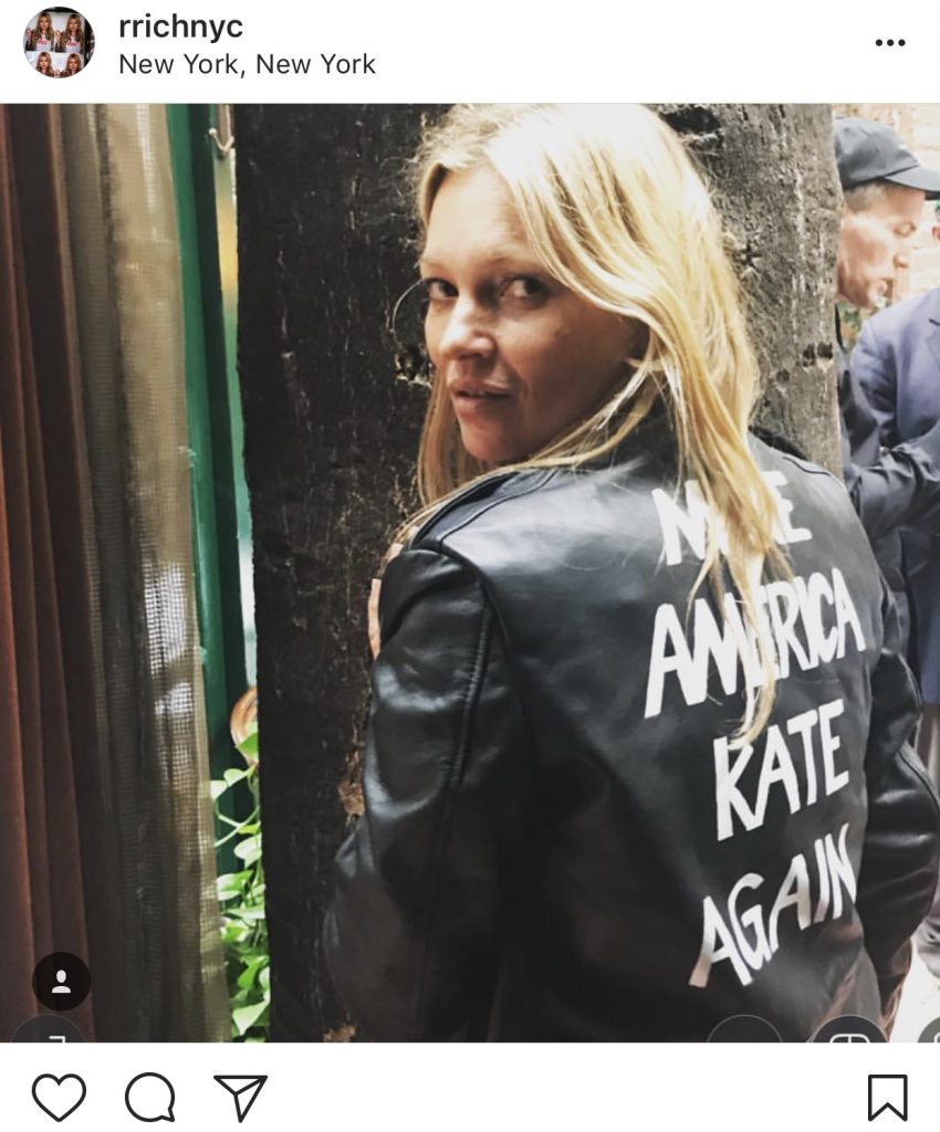 La chaqueta es de cuero negro y lleva la frase pintada a mano en la espalda. Yo animo a esta marca a producir también las gorras rojas imitando a las del presidente Trump… o mejor aún en estampado animal a lo Saint Laurent vintage. Ojalá ver a Melania con una puesta. Eso sí, para los más fans de Kate, la perfecto se puede comprar online en la web de la diseñadora neoyorkina por el módico precio de 1,295 dólares (sin gastos de envío). Se puede elegir con este mensaje o crear uno propio. Desde luego, el fenómeno Kate es un fenómeno ideológico que seguro que tiene más adeptos que el de Trump.
