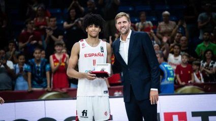 Izan Almansa recibió el trofeo que le reconoce como MVP del torneo de manos del exbaloncesista alemán Dirk Nowitzki