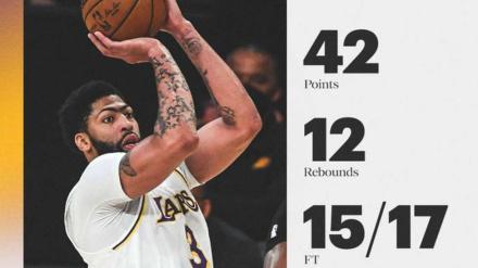42 y 12 rebotes de Davis que lideró la victoria de los Lakers frente a los Suns. Ricky anotó 18 puntos. Willy capturó 16 rebotes en el triunfo de su equipo.