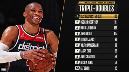 Russell Westbrook empató con el legendario Oscar Robertson en la mejor marca de triples-dobles al llegar al número 181. Curry, clave en la victoria de los Warriors.