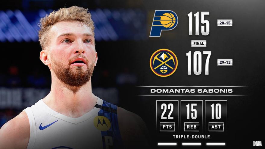 22 puntos, 15 rebotes y 10 asistencias de Sabonis en la victoria de Indiana ante Denver. Juancho Hernangómez jugó 14 minutos y anotó dos puntos.