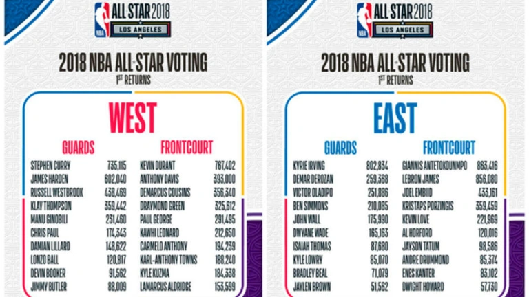 Antetokounmpo, en los primeros 12 días de votación, consiguió 863.416 votos, con lo que supera por 7.336 a James (856.080), en la Conferencia Este. Durant encabeza la lista en la del Oeste con 767.402 votos, mientras su compañero de equipo, el base Stephen Curry, es segundo (735.115), con 32.287 votos menos.