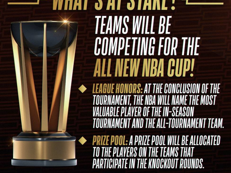 La NBA desveló las claves del primer NBA In-Season Tournament, un torneo estilo copa que se jugará anualmente en noviembre y diciembre y que tendrá en cuenta encuentros de la temporada regular antes de resolverse en una fase de eliminación a partido único. La primera competición por la NBA Cup, el nombre del trofeo que se entregará al campeón, tendrá lugar del 3 de noviembre al 9 de diciembre de 2023.