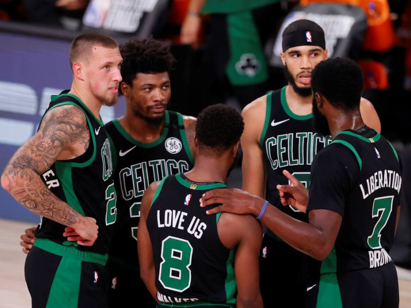 Kissimmee (United States), 17/09/2020.- Boston Celtics players Daniel Theis (L) of Germany, Marcus Smart (2-L), Kemba Walker (C), Jayson Tatum (2-R) and Jaylen Brown (R) huddle on the court during the second half of the NBA basketball Eastern Conference finals playoff game two between the Miami Heat and the Boston Celtics at the ESPN Wide World of Sports Complex in Kissimmee, Florida, USA, 17 September 2020. (Baloncesto, Alemania, Estados Unidos) EFE/EPA/ERIK S. LESSER SHUTTERSTOCK OUT