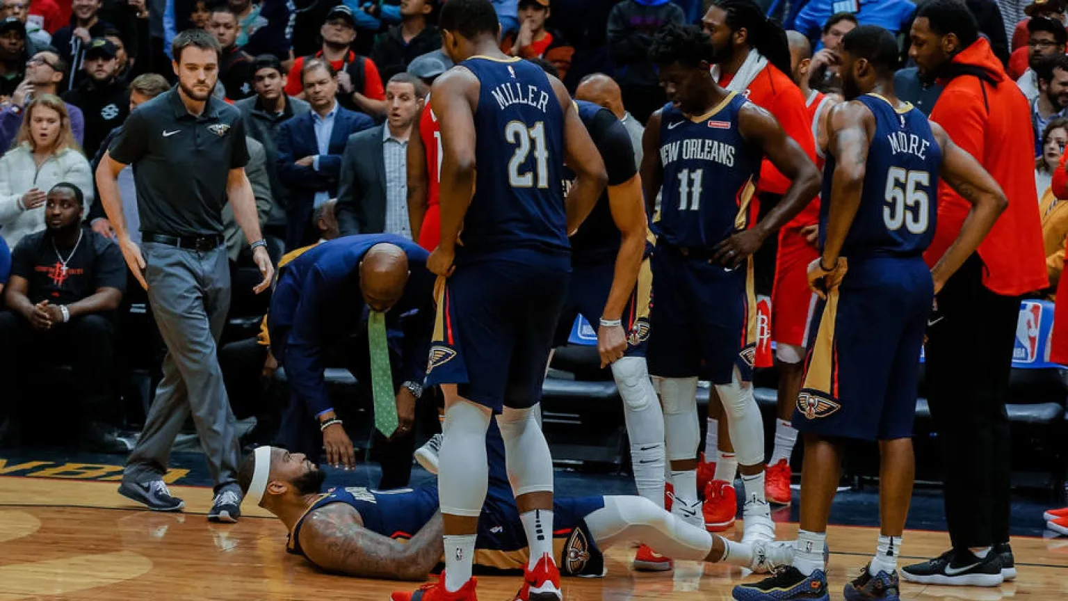 Después de saltar dos veces sobre la pierna derecha, cuando el pívot titular de los Pelicans intentó apoyarse de nuevo en la izquierda ya no pudo y se tuvo que tirar al suelo para recibir asistencia de los preparadores y ayuda de sus compañeros que lo sacaron del campo.