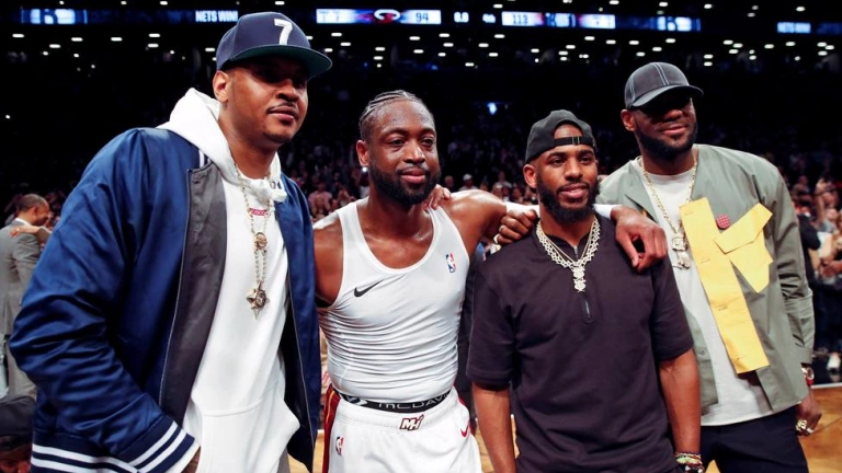Esta vez para el último "adiós" como profesional, Wade, de 37 años, estuvo acompañado por su excompañero y amigo LeBron James, el base de los Rockets de Houston, Chris Paul y el alero Carmelo Anthony, quienes lo apoyaron durante todo el partido desde la primera fila de los espectadores.