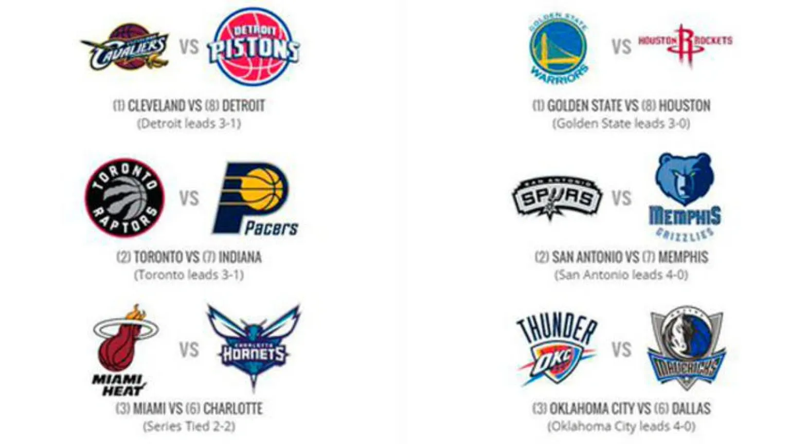 Los Warriors de Golden State asoman como primeros favoritos al título de la NBA tras cerrar la temporada regular con una campaña impecable y cifras para la historia que dejan atrás los 72 triunfos de los Bulls de Chicago de la temporada 1995-1996 con Michael Jordan. Los campeones del año pasado encabezan el convoy de dieciséis equipos involucrados en la liguilla final. Su primera prueba de fuego serán los Rockets de Houston, octavos y últimos clasificados en la Conferencia Oeste. El duelo entre ambos, a priori, puede ofrecer una revancha de las pasadas finales de conferencia que ganaron los Warriors antes de superar en la lucha por el título a los Cavaliers de Cleveland, otro favorito de peso por su condición de mejor de la Conferencia del Este. Los Warriors deben tener cuidado con un rival de gran talento individual como el que desbordan actualmente el escolta James Harden y el pívot Dwight Howard, minados por problemas físicos en la recta final de la pasada temporada. Los Spurs de San Antonio, otro equipo que ha tenido una temporada de ensueño con la mejor marca de todos los tiempos en su campo, donde sólo perdió con los Warriors, se citarán con los diezmados Grizzlies, que sienten la falta desde febrero pasado del pívot español Marc Gasol. Los Thunder de Oklahoma City, con el nuevo 'rey' de los triples-dobles, el escolta Russell Westbrook, y el alero Kevin Durant han completado una temporada ganadora bajo la batuta del entrenador novato Bill Donovan, y su duelo con los Mavericks de Dallas en la primera ronda no deberá crearle ningún problema. El partido entre los Clippers como cuartos clasificados contra los Trail Blazers de Portland, el equipo revelación en la segunda mitad de la temporada, genera morbo dentro de la Conferencia Oeste. En la del Este, los Cavaliers con el alero estrella LeBron James parten como favoritos ante los renacidos Pistons de Detroit, que quedaron octavos. James ha tratado de recuperar fuerzas de cara a la competición de la liguilla final y esta temporada ha dosificado mucho más sus minutos en el campo e inclusive ha descansado en varios partidos, incluido el último que precisamente jugaron contra los Pistons en su campo del Quicken Loans Arena de Cleveland. Los Raptors de Toronto sorprendieron con una gran temporada y estuvieron hasta el penúltima jornada en la lucha por la mejor marca con los Cavaliers para al final quedar segundos y enfrentarse en la primera ronda a los Pacers de Indiana, un equipo que si mantiene la consistencia puede ganar a cualquier rival en una serie. Los Heat de Miami completaron la temporada regular con la buena noticia de haber conseguido el título de la División Sureste, tener la tercera mejor de la conferencia, y la ventaja de campo cuando se enfrenten en la primera ronda a los Hornets de Charlotte, el equipo de Jordan, que ha realizado un buena temporada y quedaron sextos. Mientras que los Hawks de Atlanta, que en los dos últimos partidos de la temporada regular perdieron el título de la División Sureste y quedaron cuartos tendrán como rivales en la primera ronda a los Celtics de Boston, ambos con la misma marca de 48-34, la misma que también tuvieron los Heat y los Hornets.