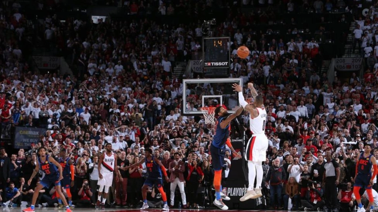 Con el partido empatado a 115 y cuatro décimas por disputarse, apareció Lillard, que desde cerca de la mitad del campo y con el marcaje de Paul George se elevó y anotó un triple monumental e histórico que convirtió el Moda Center de Portland en una auténtica locura de jugadores de y seguidores.