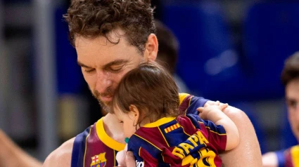 Pau Gasol, con su hija en brazos, tras ganar la Liga Endesa de la ACB con el Barça. EFE