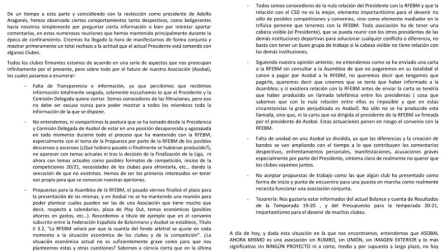 En el blog DeRosca podemos la carta firmada por esos clubes y donde piden la dimisión del presidente de la Liga Asobal.