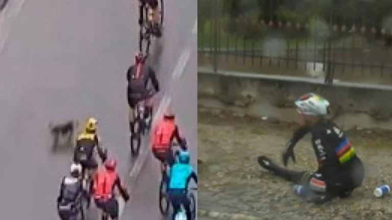 A falta de 152 kilómetros, un perro sin la suficiente vigilancia de su dueño, se ha cruzado en mitad de la carretera provocando la estrepitosa caída del campeón del mundo que este martes cedió la maglia rosa. Tras el susto, Evenepoel ha levantado el pulgar como gesto de que se encontraba bien.